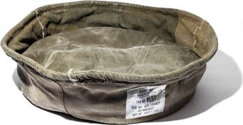 I am not sure what this could be used for, but let’s just buy it anyways.” Because of my habit, I bought something like a shallow bucket shape made from military cloth when visiting a flea market in the United Kingdom. I was informed by an exhibitor that the cloth bucket was laid on the ground by soldiers taking showers outside. This was hard to believe but I was attracted to its shape anyways. A few years later, when we talked about making a bed for pets, I remembered that cloth military bucket and used it as inspiration to create our own. The fabric was reused from tents sold by the military. After attaching rope and sewing it together, we washed it to look like well worn old jeans. We had several animals sleep in the trial product and they seemed quite comfortable.