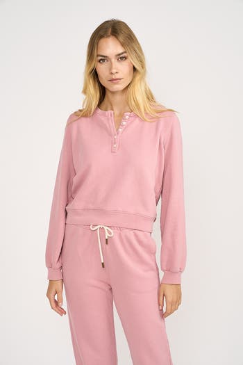 Infused with retro vibes, this Henley Sweatshirt is the perfect blend of style and comfort. Crafted from garment-dyed terry, it features a vintage wash and an iconic Henley neckline that exudes effortless charm. With its relaxed, easy fit, this versatile piece seamlessly transitions from lounging to errands and beyond. Pair it with coordinating joggers, shorts, denim, or layer it over a swimsuit for endless styling possibilities. Thoughtful design details include a functional front button closure, ribbed trim on the collar and sleeve cuffs, and a 100% cotton composition for softness and breathability. A staple you'll reach for every day! *Garment-dyed styles are special and need just a little extra love and care! Avoid stain removers with bleaching agents or strong acids, as they may alter the color. Stick to a gentle, neutral pH formula, and when in doubt, spot test first!