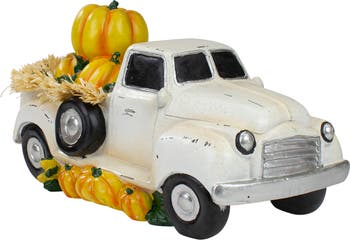 Enhance your fall and Thanksgiving décor with this charming white distressed tabletop truck, a perfect centerpiece for your autumn celebrations. The vintage-inspired truck is overflowing with pumpkins and hay, evoking the warmth and bounty of the harvest season. Nestled beneath the truck, additional pumpkins and corn create a layered, festive display that captures the essence of Thanksgiving gatherings. Crafted with attention to detail, this Thanksgiving tabletop decor features a distressed white finish that complements farmhouse, rustic, and traditional fall décor themes. Its compact size makes it ideal for placement on dining tables, entryway consoles, mantels, or sideboards, allowing you to create a cozy, seasonal focal point in any room. The combination of pumpkins, hay, and corn adds texture and depth, creating a visually appealing arrangement that celebrates the colors and harvest spirit of autumn. Perfect for autumn decorating, Thanksgiving displays, and seasonal centerpiece arrangements, this vintage truck decor blends festive charm with practical tabletop design. Whether used alone or paired with other fall décor accents, it instantly enhances the seasonal ambiance, making your home feel welcoming and festive for family gatherings, holiday parties, or everyday fall enjoyment. Celebrate the season in style with this fall truck decor. Features: Vintage-style truck design with a distressed finish Decorated with straw bales and pumpkins The truck rests atop corn husks and more pumpkins Recommended for indoor decorative use only Dimensions: 6.75"H x 11.25"W x 5.5"D Material(s): polyresin/straw