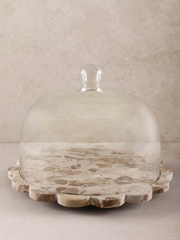 The Viola Serving Board with Cloche brings artisanal elegance to entertaining, crafted from premium onyx marble in warm shades of brown and beige. Hand-carved with a distinctive floral cut design, its surface showcases natural veining and tonal variations that make every piece unique. The smooth polished finish highlights the depth and translucence of the stone, while the domed glass cloche preserves freshness and enhances presentation. Substantial in weight yet refined in detailing, Viola transforms everyday gatherings into experiences of beauty and refinement. Beyond functionality, the Viola Serving Board enriches interiors with sculptural sophistication. Place it at the center of dining tables, buffets, or kitchen counters, where the floral cut form and earthy palette add charm and dimension. Suitable for serving cheeses, desserts, or small bites, it pairs timeless natural stone with the clarity of glass to create an elevated stage for culinary artistry. More than serveware, Viola reflects craftsmanship, permanence, and the quiet luxury of natural materials, turning hosting into an artful ritual.