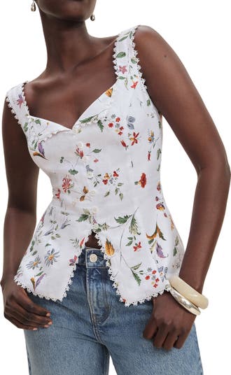 Lacy scalloped trim furthers the vintage romance of a sleeveless button-front top fashioned from lightweight linen.