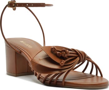 Tubular straps and petal-inspired accents add a romantic flourish to a Brazilian-made sandal set on a wrapped block heel and secured with an adjustable buckle closure.