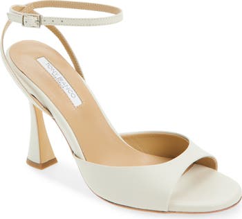A sculpturally flared stiletto shakes up the clean minimalism of this party-perfect ankle-strap sandal made from smooth leather.