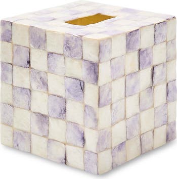 Being prepared for every sneeze and sniffle gets a lot more elegant with this tissue box cover made from capiz inlaid with signature purple checks.
