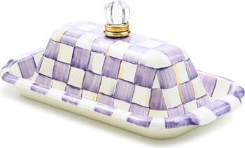 Hand-painted color-dragged checks further the retro vibes of this enameled-steel butter box covered with a glass-knob topped lid that keeps sticks fresh and ready to spread.