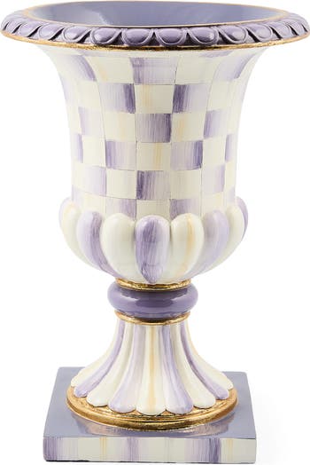 Elevate your tablescape with this sculptural pedestal urn that's perfectly sized for topiary drop-ins and hand-painted in signature color-dragged checks with golden accents.