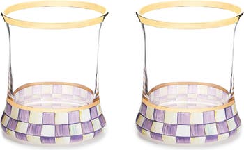 Hand-painted violet checks add signature charm to this set of stunning mouth-blown glasses finished with opulent golden trim.