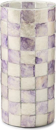 Showcase a bouquet of fresh blooms in this beautiful glass vase designed with a capiz shell inlaid layer hand-painted with signature violet-hued checks.