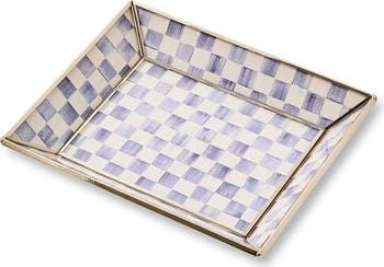 Gilt details highlight the hand-painted, color-dragged checks on this glass tray, which is a perfect organizer-catchall for the powder room, vanity and office desk alike.