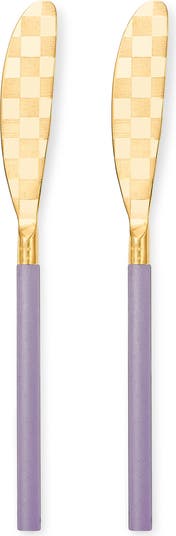 Durable stainless steel spreaders are given party-ready personality with contrast handles and signature color-dragged checks.