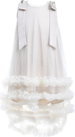 The Violeta dress featuring a sleeveless cut, dual bows on the shoulders. Lightweight tulle overlay from shoulder to hem with frill design at the hem. The perfect dress for any special occasion!