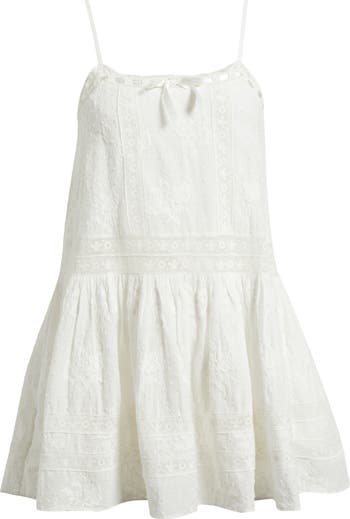 Light and playful, this cotton minidress is designed in a breezy silhouette with a softly shirred skirt. Allover floral embroidery adds texture, while a front bow at the neckline and delicate lace accents bring a romantic finish.