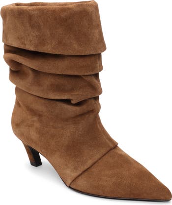 A slouchy shaft and pointy toe create stunning dimension on a supple suede bootie set on a concave kitten heel for a stylish hint of height.
