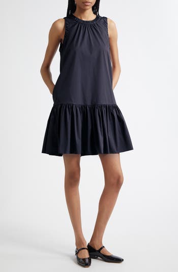 Shirring at the neck and armholes brings captivating texture to this stretch poplin dress cut in a drop-waist silhouette with a flouncy hem.