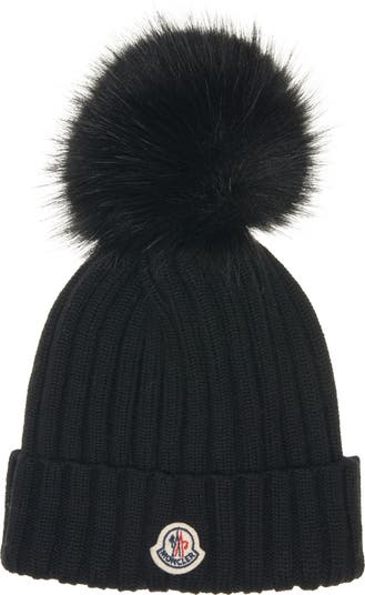 Virgin Wool Rib Beanie with Faux Fur Pompom