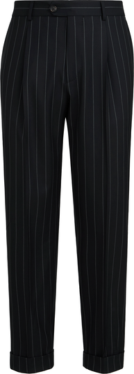 The sartorial taste of the wide chalk stripe is enhanced by the sophisticated quality of the pure wool 150s twill. The processing of the very fine yarn allows the creation of a lightweight fabric that is also compact and very comfortable.