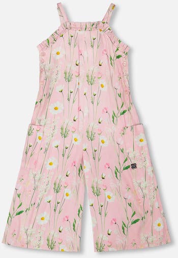 Our viscose jumpsuit pink with printed flowers is a charming and comfortable piece for girls. This sleeveless one-piece features wide legs, an allover floral print, a delicate frill trim at the neckline, side buttons at the top, and two large patch pockets on the side for a playful touch. Crafted from a lightweight blend of cotton and viscose, it offers both breathability and softness with every wear.