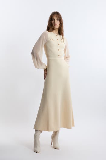 Elegant maxi knit dress with striking military-inspired gold buttons down the front. Sophisticated crew neckline complemented by decorative button-flap chest pockets. Dramatic sheer chiffon balloon sleeves create a beautiful contrast against the structured knit body. Flattering a-line silhouette that gently skims the figure for all-day comfort. Versatile 125cm length perfect for transitioning between seasons.