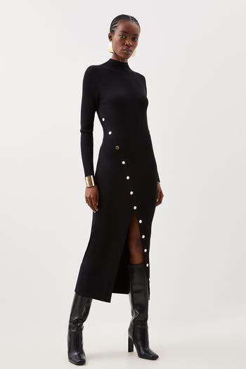 This Karen Millen knit midi dress showcases impeccable craftsmanship with its body-contouring ribbed texture and distinctive popper detail that allows for adjustable split styling. Perfect for daytime sophistication, pair with knee-high boots as shown for a polished autumn ensemble, or style with flat ankle boots and an oversized tote for family gatherings.