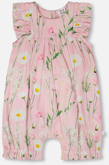 Our viscose romper pink with printed flowers is a delightful piece designed for baby girls. This one-piece playsuit charms with flutter sleeves, a square neckline, a soft allover floral print, and gathered hems for a playful silhouette, while snap button closures at the back ensure easy dressing. Made from a breathable blend of cotton and viscose, it is finished with bottom snap closures at the legs for convenience during changes.