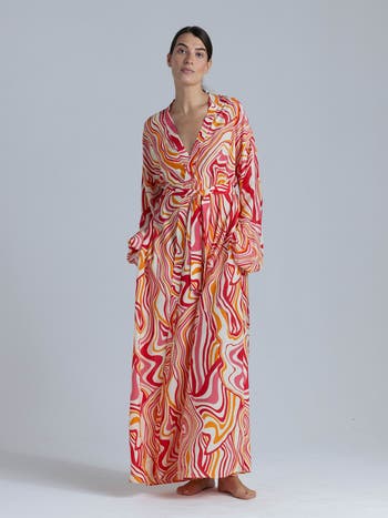Spend the day in a long red robe in beach wave print. Designed to offer both style and comfort, this exquisite piece is your perfect companion for those serene beach days or relaxed evenings at home. The floor-length red robe is crafted from premium viscose material, it provides a soft, lightweight feel that gracefully drapes over your silhouette.