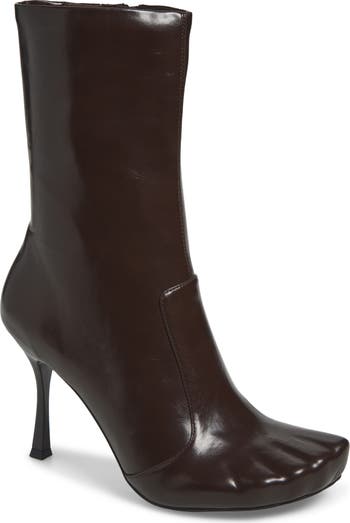 A flared stiletto heel takes you to soaring new heights in this glossy boot designed with a softly ridged toe.