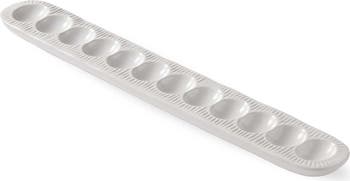• The Vista Grey Egg Serving Platter is made of elegant white stoneware and measures 22.02 inches long, 3.31 inches wide, and 1 inch high.