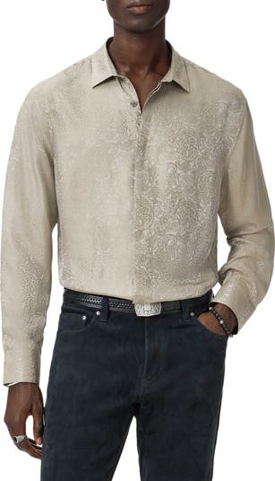 Shimmering paisleys emerge from the cool jacquard fabric of a shirt made with a touch of silk and finished with covered front buttons to keep the finish streamlined and smart. Wear it tucked or untucked to change up your look without ever losing your style.