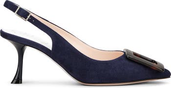 Modern and versatile, this suede slingback pump is topped with a tortoiseshell-colored resin buckle and perched on a flared stiletto heel.