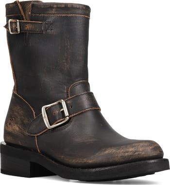 Buckle straps and strategic distressing enhance the lived-in appeal of this leather moto boot grounded by a comfort-cushioned footbed.