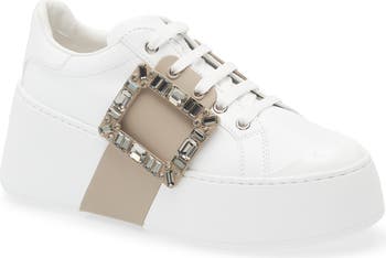 Casual streetwear meets couture heritage on a leather sneaker set on a chunky platform cupsole and finished with a crystal-embellished signature buckle.