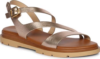 Asymmetric vamp straps create modern dimension on a weekend-ready sandal rendered in sleek leather and grounded by a subtle platform sole.