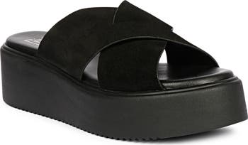 Step up your look with this platform sandal topped with wide crisscross straps made from durable suede.