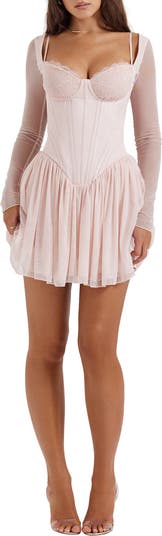 Lacy underwire cups lend romance to this corset-inspired minidress with signature boning, floaty mesh and a flared skirt.