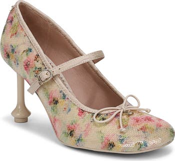 A flared stiletto heel and crystal-studded buckle provide glam finishing touches to this glossy patent pump that's ready for your moment in the spotlight.
