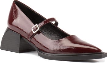 A pointy toe sharpens this modern mary jane pump shaped from crinkled patent leather and set on a flared block heel.