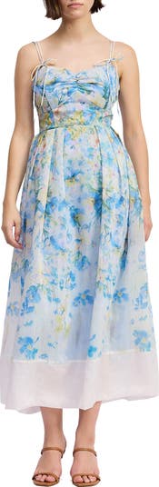 A smocked back brings comfort and shape to this strappy midi romanced by mesmerizing watercolor blooms and finished with a flared skirt.