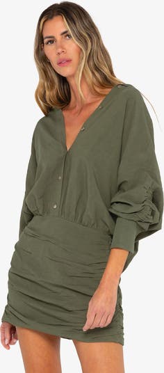 The Vivie Dress in Olive Bizet Linen is a relaxed mini with a softly structured feel. It features a deep V-neck with button detailing, long sleeves, and a ruched skirt that creates a flattering, draped silhouette. Effortless, modern, and easy to wear.