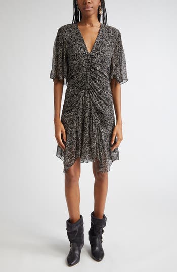 Delicate chiffon and allover ruching shape this printed V-neck dress framed by fluttery elbow-length sleeves.
