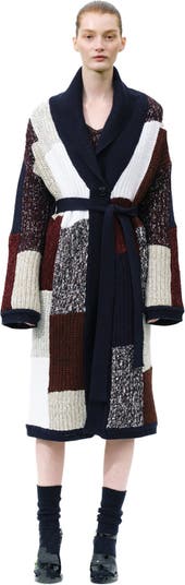 Stay warm in the comforting embrace of this 100% wool cardigan.This chunky knit is an array of autumnal colours; ecru, oatmeal, maroon and navy, its patchwork truly makes this piece a show stopper. The robe design is complete with a large button and tie waist detai