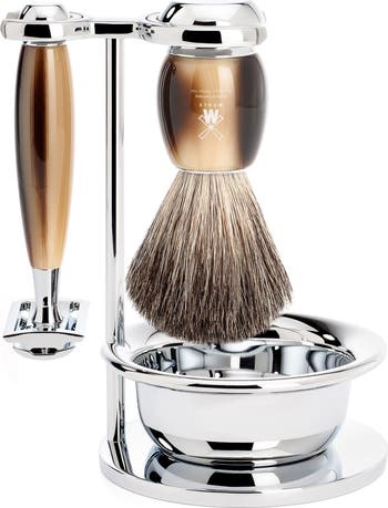 4-part shaving set with bowl, handles of high-grade resin with chromed metal accents: Shaving brush with pure badger Shaving brush size M = medium shaving brush head with 21 mm ring Safety razor, compatible with classic razor blades Soap dish made of metal, chrome-plated Stand made of metal, chrome-plated The Material - High-grade resin High-grade resin is a high-quality synthetic material, the surface of which is processed and refined separately. The material is ideal for exclusive accessories and writing implements because it facilitates a broad spectrum of modern and classical designs in many attractive colours. To begin with, the aesthetic basic shapes for brush and razor handles are turned out of solid rods. Then each individual work piece is polished in several passes to give the surface its special gleam. This processing method lends the models a pleasant feel and secures their beauty for many years to come. The Brushhead - Pure badger Pure badger is the basic quality among the natural hair types. The material is recognizable by its relatively dark colouring. The individual hairs are somewhat thicker, but still soft and much more flexible than bristles. This quality is highly recommended for those wishing to take a badger hair brush that provides a slightly stronger massage effect. We manufacture this product mechanically according to the same high standards which we apply to all MÜHLE products. The Razorhead - Classic razor blade For generations, the safety razor has been regarded as a stylish classic which can even shave edges with precision. For many, it is the razor par excellence. Its styling is ideally suited to the design of the MÜHLE products. Even if the open blade does demand a little respect at first: After a brief familiarisation period, and guided by a steady hand, it produces a very close shave and a lasting result. Unlike modern blade systems, the head of the safety razor does not move. The blades are replaced by unscrewing the cap. They can be purchased from us and by retailers everywhere. We recommend our rust-proof MÜHLE razor blades which are the perfect match for our safety razors.