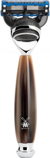 5-blade razor, compatible with Gillette Fusion Handles made of high-grade resin with chrome-plated metal highlights The Material - High-grade resin High-grade resin is a high-quality synthetic material, the surface of which is processed and refined separately. The material is ideal for exclusive accessories and writing implements because it facilitates a broad spectrum of modern and classical designs in many attractive colors. To begin with, the aesthetic basic shapes for brush and razor handles are turned out of solid rods. Then each individual work piece is polished in several passes to give the surface its special gleam. This processing method lends the models a pleasant feel and secures their beauty for many years to come. The Razorhead - Gillette Fusion The latest shaving system from Gillette embraces five blades positioned one above the other as well as a precision edging blade located on the back of the cartridge. This design ensures a very close and gentle shave. Its simple and safe handling is ideal even for newcomers. The blades are available from retailers everywhere.