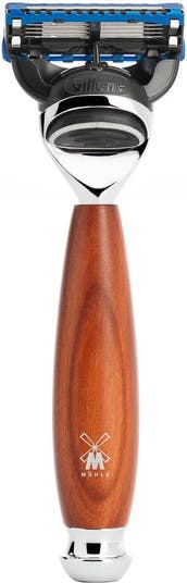 5-blade razor, compatible with Gillette Fusion Handles made of plum wood with chrome-plated metal highlights The Material - Plum wood The wood of the plum tree offers intriguing coloring, a vivid grain and is very hard and robust. To protect the wood against water, the surfaces are sealed with oil. The resulting soft gleam is a deliberate and highly attractive side effect. The Razorhead - Gillette Fusion The latest shaving system from Gillette embraces five blades positioned one above the other as well as a precision edging blade located on the back of the cartridge. This design ensures a very close and gentle shave. Its simple and safe handling is ideal even for newcomers. The blades are available from retailers everywhere.