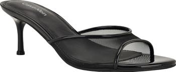 Glossy faux-leather trims highlight the airy mesh upper on an alluring slide sandal set on a modest, tapered pin heel.