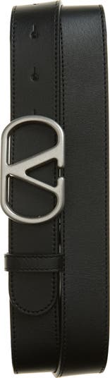 An antiqued VLOGO buckle based on a 1979 archival motif boldly brands this Italian-crafted belt made from smooth box-calf leather.