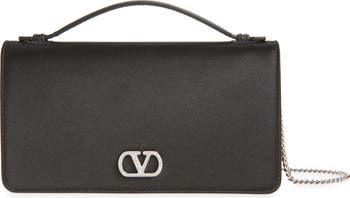 This lustrous satin wallet embellished with a diamante VLOGO can be carried by hand or worn as a shoulder/crossbody bag thanks to the leather handle and detachable antiqued-silvertone chain.