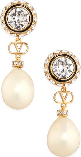 A signature VLOGO link is suspended between a faceted crystal set in a pavé bezel and a swingy faux‑pearl drop, creating stunning earrings that embody the label’s timeless elegance.