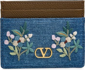 The season's floral-embroidered denim theme wraps this leather card case in '70s-nostalgia charm.