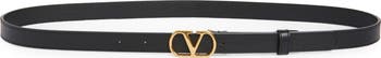 An archival VLOGO buckle boldly brands a smooth calfskin belt that adds Valentino's signature opulence to any ensemble.
