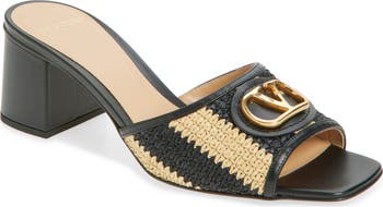 High-polish VLOGO hardware brings house-signature shine to this resort-ready slide sandal featuring an artfully woven raffia upper in two-tone stripes.